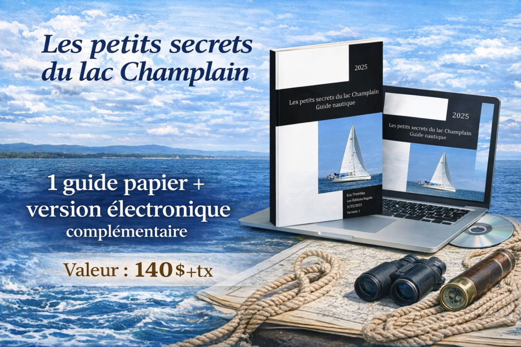 Pemier guide nautique francophone sur le lac Champlain qui regroupe une multitude d’informations sur la navigation (le sommaire est de 18 pages!) et sur plus de 168 mouillages.